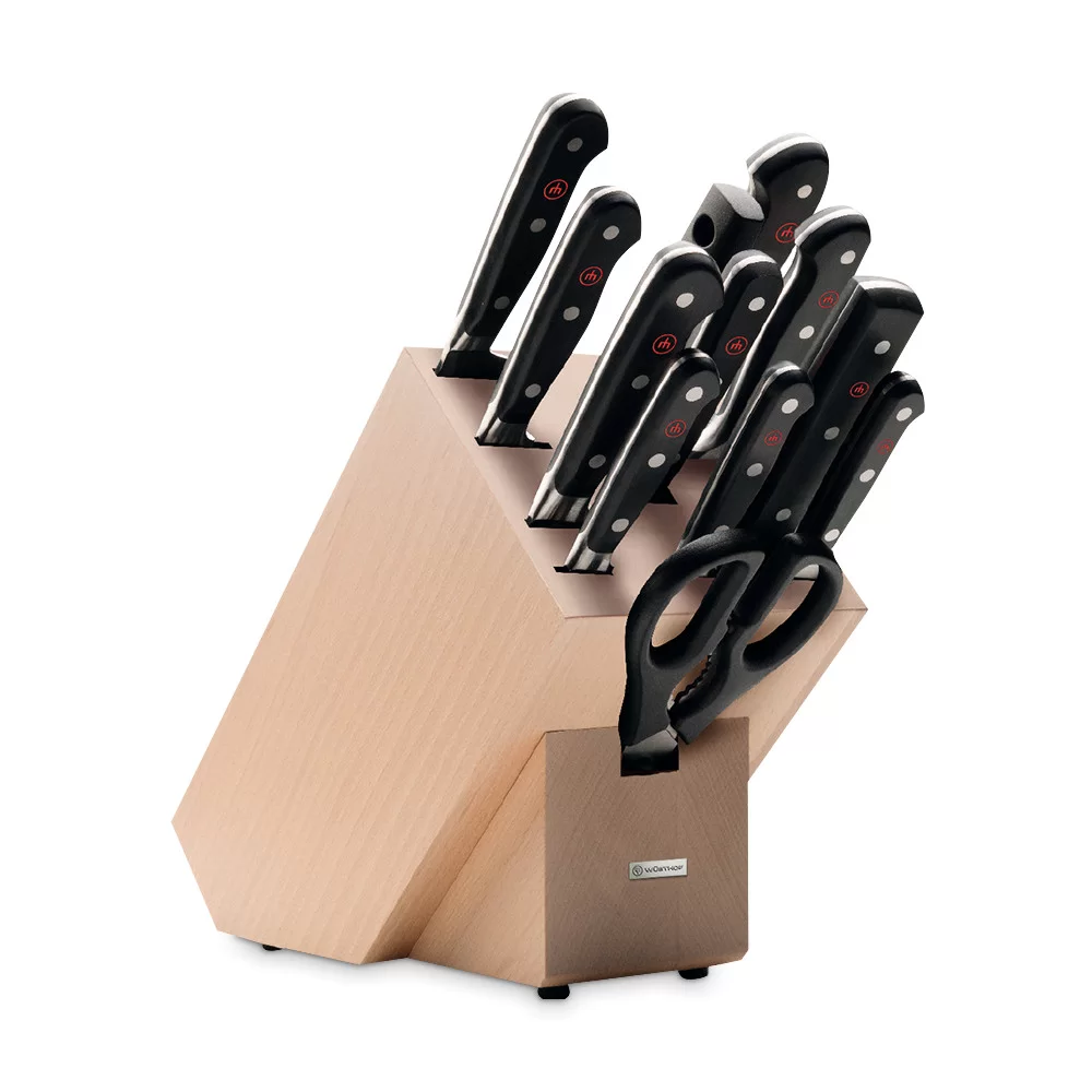 Набор из 9 кухонных ножей + ножницы+вилка+мусат на деревянной подставке, кованая сталь, Wusthof, Германия, 1090171201